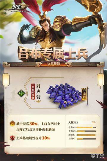 与吕布同时登场的,还有他的金色品质专属士兵“射声营”,当主将存活时士兵阵亡后可以补充至满编,拥有超强续航能力。