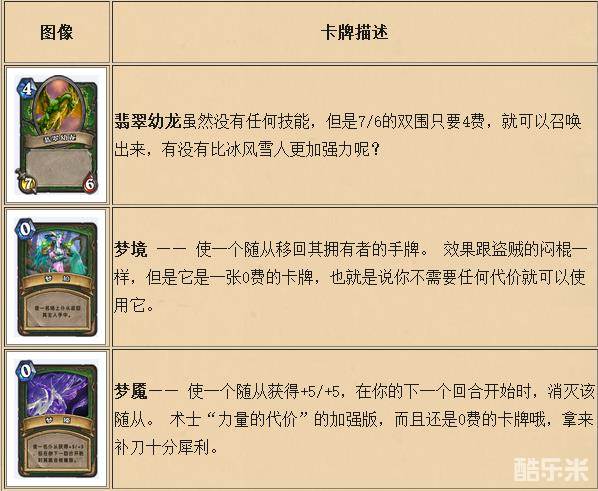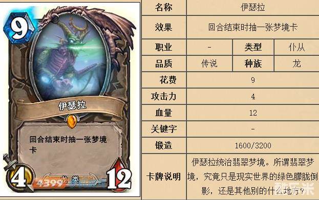 伊瑟拉的每张梦境卡都十分有用,所幸的是,它需要9费才能将其召唤出来,后期应对的手段也比较多,不至于无解的地步。但4/12的血量摆在那,没有变羊、刺杀这类秒杀类的法术,想要打掉它还是十分困难的。