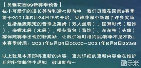 在小可爱们的漫长等待和满心期待中,我们贝雅花园第9赛季将于2021年5月24日正式开启,贝雅花园中新增了许多奖励,包括绝版限定的音律史莱姆(双人坐骑)、国潮时代(服饰)、海螺水袋(水袋)、樱花背包(背饰)、淘淘鸭(头像)等伴随赛季出现的新奖励,让我们准时相约S9赛季不见不散!