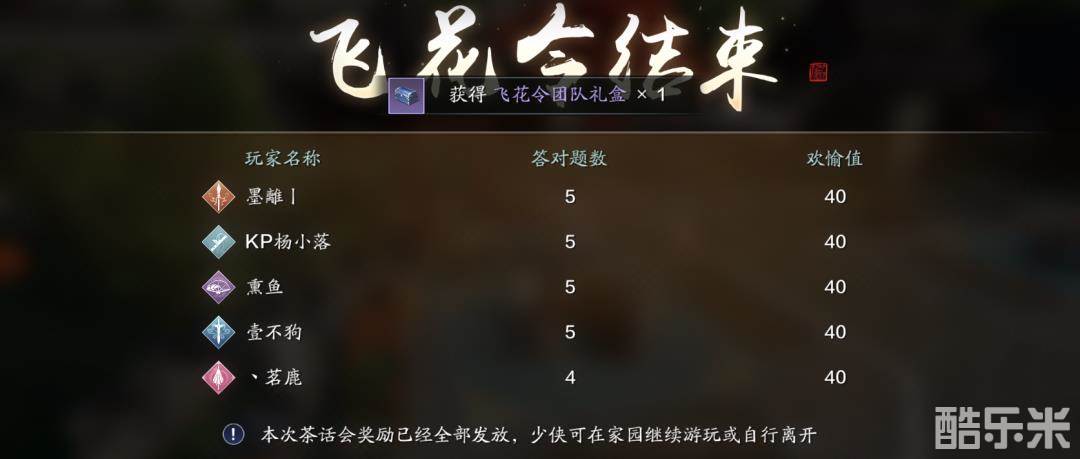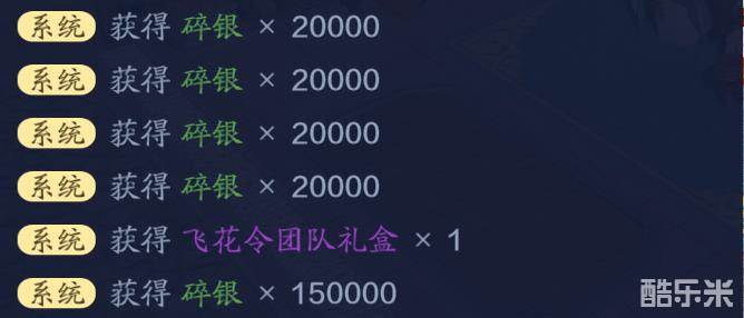 茶话会奖励:虽然茶话会奖励只有一次,但是参加不同茶话会,答对飞花令题目都有2W碎银奖励,而契合度礼盒也可以多次获取,可以开出5W~100W碎银不等(飞花令每周最多上限25次=50W,许愿树5次)。所以缺碎银的小伙伴赶紧行动起来,现在百宝箱也增加了飞花令答题功能,答题全对没有难度!