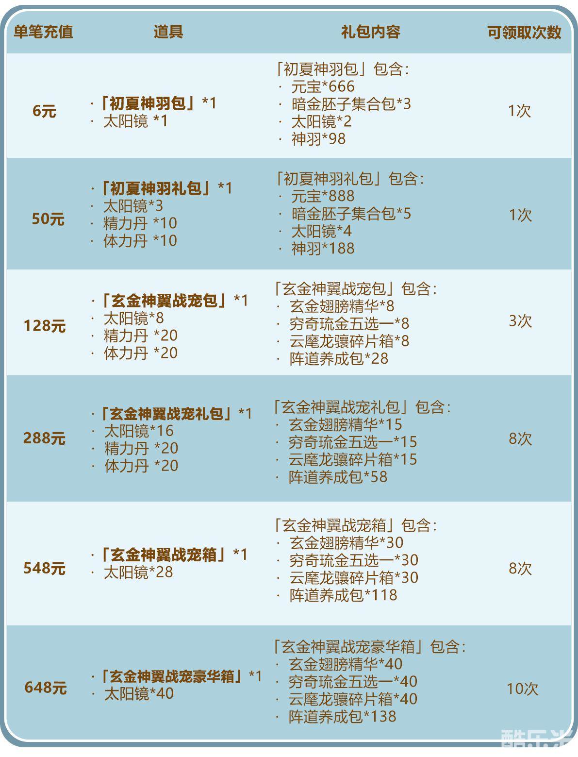 在活动期间少年们单笔充值至指定金额,即可获得玄金翅膀精华、穷奇琉金五选一、云麾龙骧碎片箱、阵道养成包、太阳镜等资源: