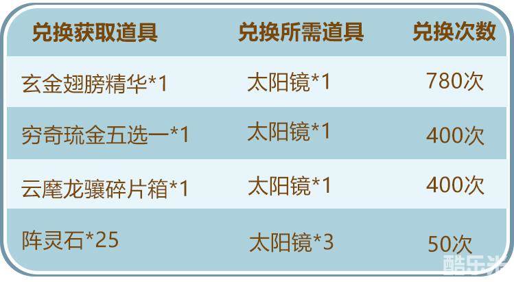 「太阳镜」可用来兑换玄金翅膀精华、穷奇琉金五选一、云麾龙骧碎片箱等稀有资源: