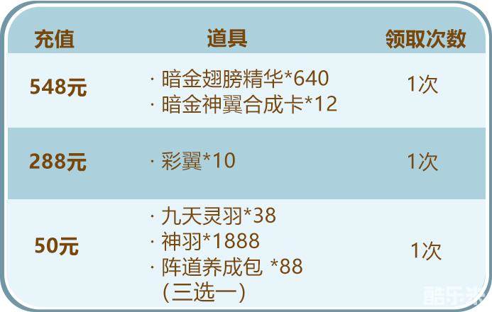 少年们单笔充值指定金额,即可得到暗金翅膀精华、彩翼等珍稀资源,少年们千万不要错过哟~