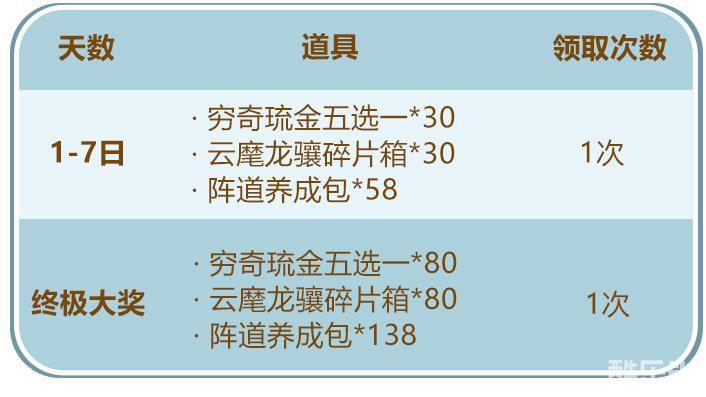 1-7日可领取:「穷奇琉金五选一」*30 或 「云麾龙骧碎片箱」*30 或「阵道养成包」*58