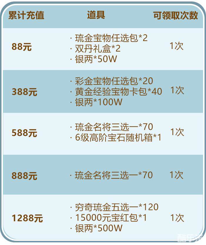 初夏欢乐狂欢!累计金额到达指定档位即可领取琉金名将、琉金战宠、琉金宝物、高阶宝石等资源!