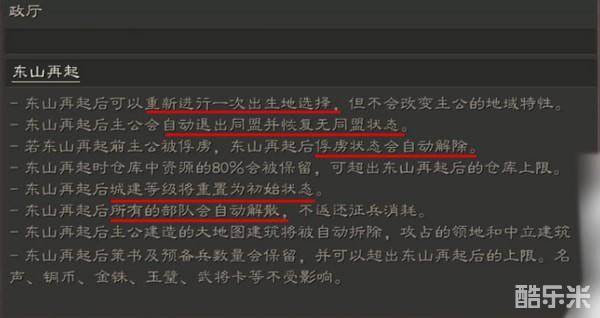 东山再起可以手动选择任意州作为再起之地。但是选择东山再起会清除君王主城的城建等级和所有已经占领的领地(包括分城),相当于之前的发展全部废弃了。再起后会保留仓库现有资源的80%,并且在重建后会直接解除俘虏状态。