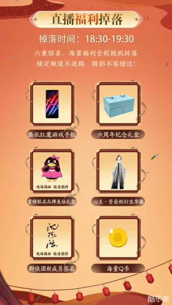 豪华NPC阵容带你沉浸式畅玩四大名绣溯源之旅、揭秘四大名绣集邮收官之作蜀绣/蜀锦主题外观“天衣·锦城”真容、看天刀IP最新爆料彩蛋,还有六周年纪念礼盒、心王·苦昼短华服与海量Q币等史上最丰厚豪礼全程随机掉落!本次活动还将揭秘天刀群侠团全新成员与最新IP联动计划,更有由腾讯红魔游戏手机独家赞助的最新款手机现场掉落,游天刀江湖更加丝滑顺畅!