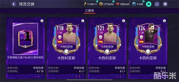 通过不断完成指定任务获得三周年纪念代币,即可在游戏中“球员交换”玩法中对卡西利亚斯进行能力值提升。