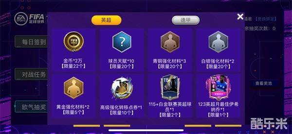 玩家获取的抽奖次数可以再“欧气抽奖”抽取海量资源,奖池中更含有英超月最佳伊希纳乔和德甲月最佳科斯蒂奇活动(奖池未不放回抽奖,累计100抽即可得单一奖池所有奖励)!
