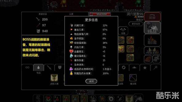 反复刷90层凑个大概齐再去找BOSS,在进入100层楼梯之前就把装备换好,属性方面推荐直接堆满回血和回魔属性即可。