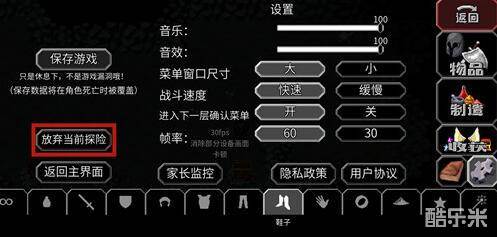 当我们想要离开洞穴,又没有逃脱之翼的时候就只能在设置中选择“放弃当前探险”了,放弃之后本次在洞穴中获得的所有道具都没法带出去。