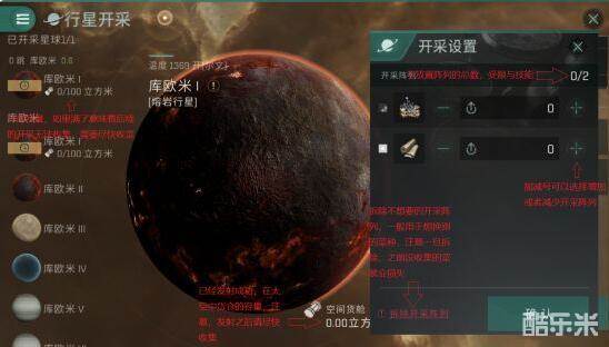 玩家在行星开采界面选择一个目标行星后就可以进行开采设置的选择。玩家根据自己需要的行星产物来确定目标星系。这张图中给玩家们标示了该界面下的主要操作内容,玩家注意可以一次设置多个开采阵列,以及货仓容量情况,注意及时收取即可。