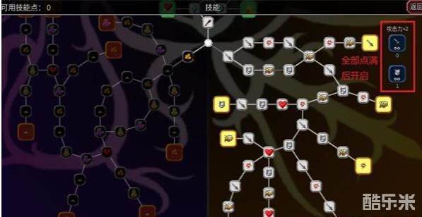 如图所示,技能树分上左右三大支。分别对应魔法、收集、攻防技能。