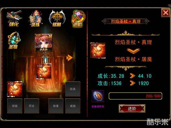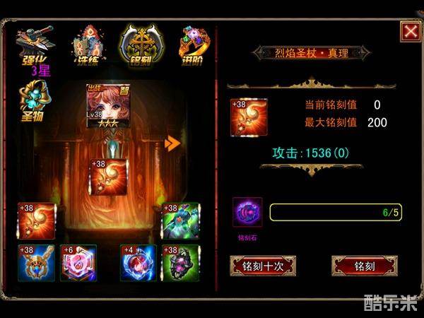 玩家可以使用铭刻石使装备获得额外属性,同样先给专属神器铭刻,避免浪费资源。