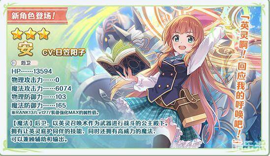 安是本次巴哈姆特联动活动的新三星人物。属于一名魔法后卫,能够为玩家们的法师队伍提供强力的支援,是一名很优秀的输出型法师,还具备一定的辅助能力。
