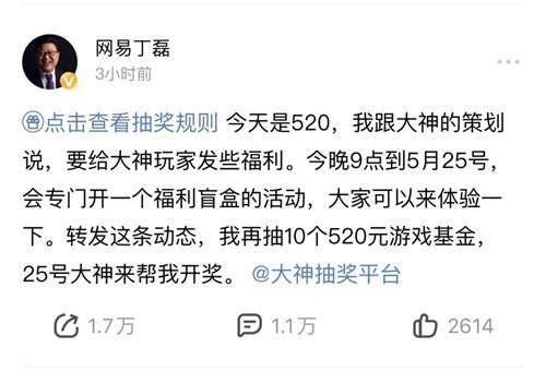 520现金红包十连抽,引爆玩家热情!除此之外,丁磊还特意为大神玩家开启了专属福利盲盒活动,用超高价值礼品回馈各位游戏热爱者!