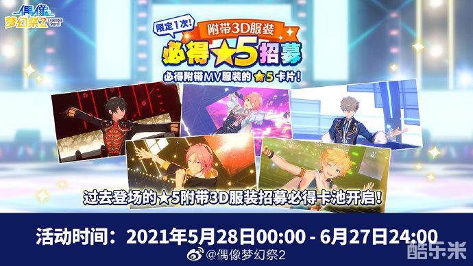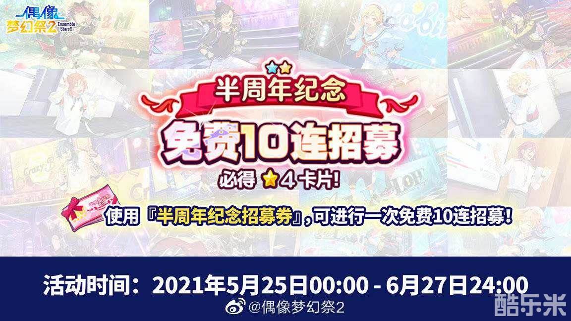 5月28日00:00-6月27日24:00,半周年必出附带3D服装★5招募开启。游戏内将推出纪念卡池,制作人可使用2000付费钻石,在钻石商店购买【半周年付费钻十连★5卡片保底券】(每位制作人仅可购买一次),进行十连招募,招募必得★5卡片。