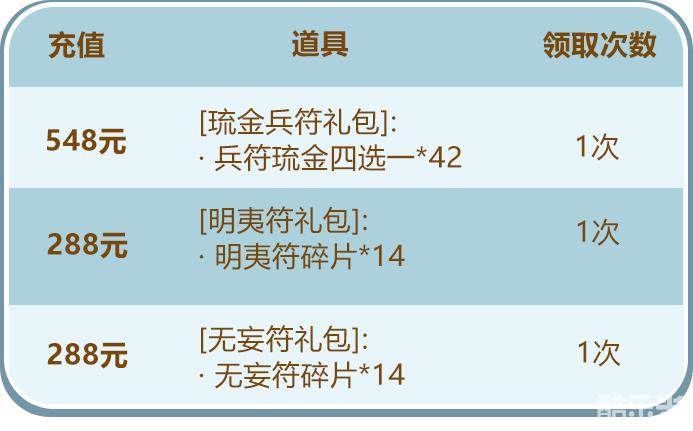 少年们单笔充值指定金额,即可得到兵符琉金四选一、明夷符碎片、无妄符碎片等珍稀资源,少年们千万不要错过哟~