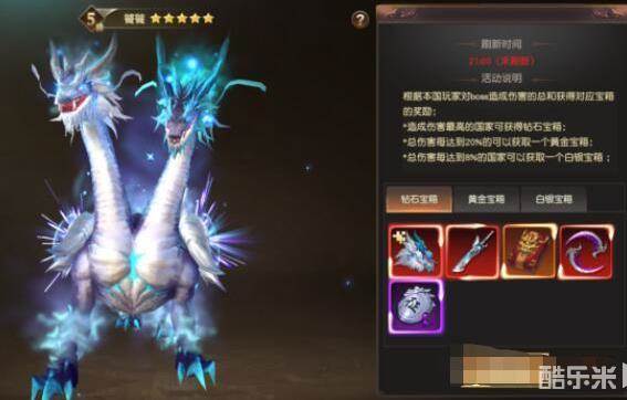 该boss在每天晚上9点刷新,此boss无法拉脱,双方国家将以伤害来决定奖励,伤害最高的国家可以获得钻石宝箱,每20%可以获得一个黄金宝箱,每8%可以获得一个白银宝箱。