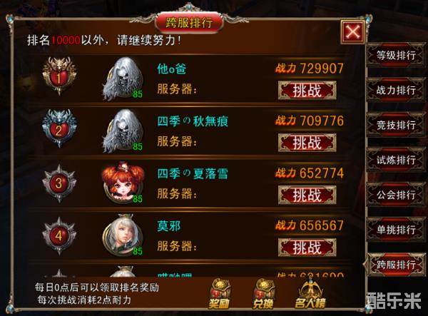 点击人物头像下方的【排行】,然后点击最下方的跨服排行。便可看见全服参与跨服竞技的玩家名次,跨服排行榜只会显示10名玩家的排名。若想看到靠前的名次,只有继续向前挑战。参与跨服竞技需要玩家在自身服务器竞技场的排名要在100名以内,否则无法参与跨服竞技。跨服竞技随时都可以挑战,无次数限制,每次挑战需要消耗2点耐力;战斗规则与竞技场相似,每天0点结算,并通过邮件方式发放奖励;前十名的玩家会进入名人榜;
