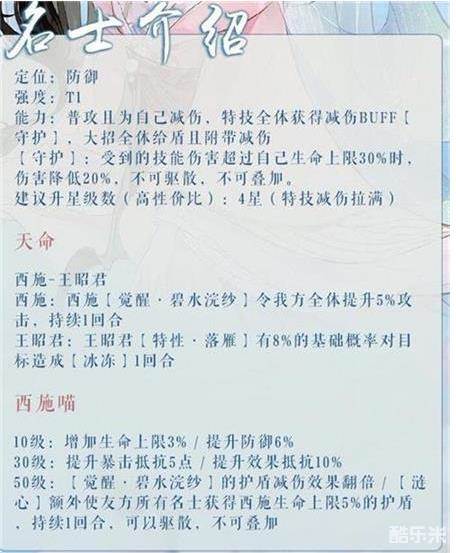 西施作为纯上位版高渐离,组建阵容时以肉队的思路为主,搭配杨玉环、王昭君等控制、高回复单位,形成一个半肉半输出的阵容,平时就养了一些肉队名士的使君可以考虑养一下。