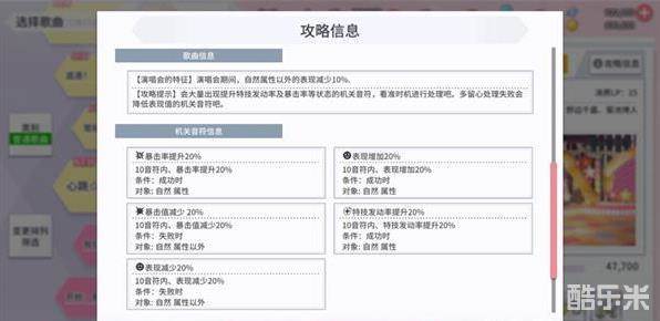 想要了解歌曲中的“表现机会”具体有哪些可以查阅歌曲的“攻略信息”,遇到“表现机会”时尽力去完成吧!