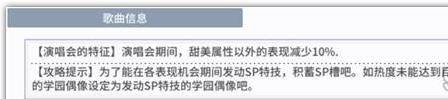 以中级难度的《我们的奇迹》为例,它的“演唱会特征”为“演唱会期间,甜美属性以外的表现减少10%”,这意味着演唱会编队中除了“甜美”属性的学园偶像都将受到表现数值降低的影响,这时玩家的演唱会编队就可能需要更高的能力值或尽可能地增加“甜美”属性的学园偶像来降低影响。