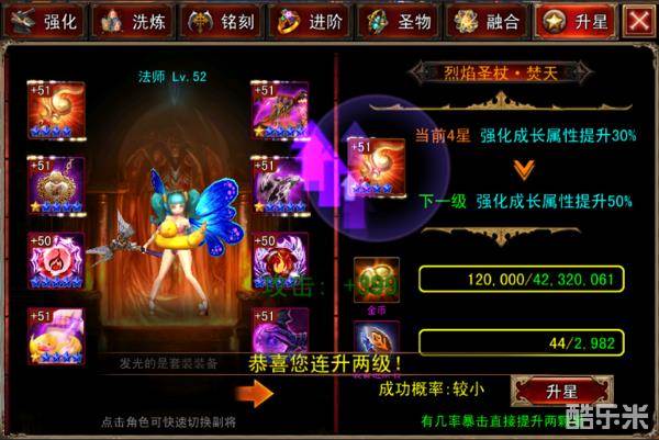 4、升星需要消耗装备进阶石与金币,每提升一星会增加装备百分比属性,升星过程中,有概率直接提升两星,升星失败星级不变。坐骑进阶会保留原有星级;