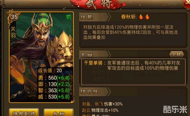 【技能简析】:关羽的技能是打后排,并且附加流血效果,主要起到切后排的作用。觉醒技能属于触发类的伤害技能,在队友的普攻帮助下能发挥出最大的效果,对自身并没有提升,算半个辅助技能,团战武将。
