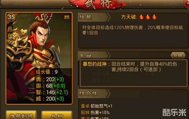 【技能简析】:从技能上看吕布是全体物理伤害,并且有着120%的高伤害和20%眩晕几率,作为战神居然是打控制的,技能伤害不如赵云,许诸等高。觉醒后没回合可以提升40%的伤害就是一个转折点,技能伤害和普攻伤害都可超越所有物理的武将,正真暴怒的战神是在满觉才开始!(暴怒的推城战神)
