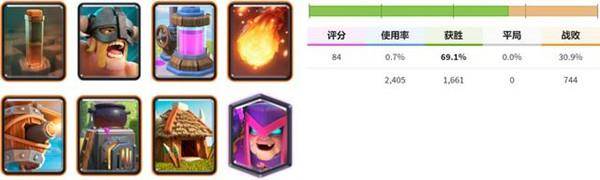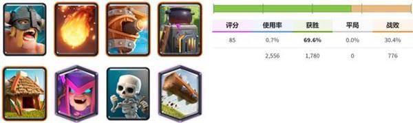由上面的卡组可以看出,女巫婆婆在高胜率卡组中的登场率很高,因为狂暴状态下女巫婆婆能够更快地将敌军打成野猪。此外版本强势卡牌野蛮人精锐的出场率也很高,配合狂暴状态的野蛮人精锐很容易打出高额伤害。