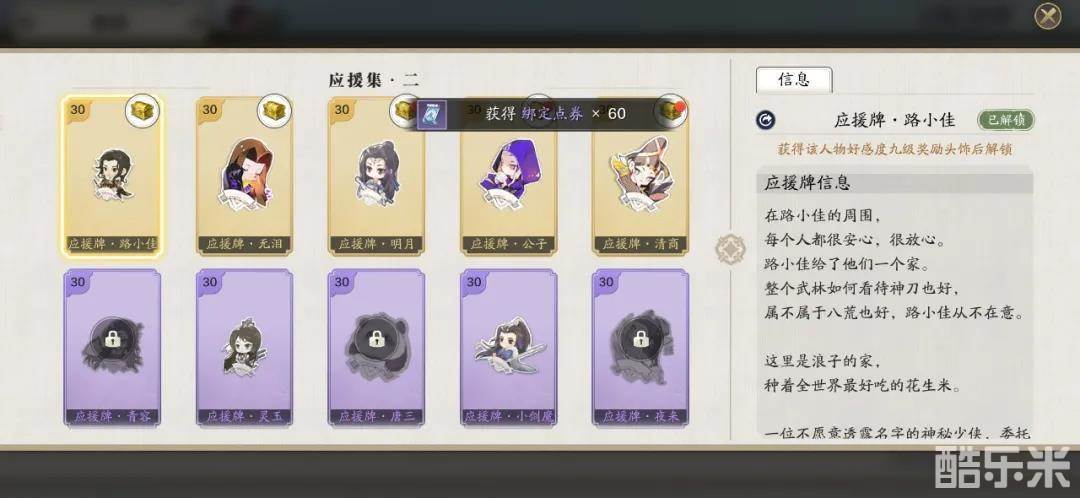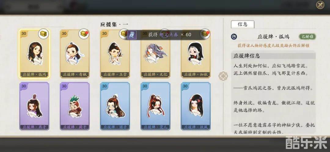 2、解锁沈孤鸿,唐青枫,离玉堂,曲无忆,叶知秋5个人物好感度9级获得应援牌,共可以获得240绑点。