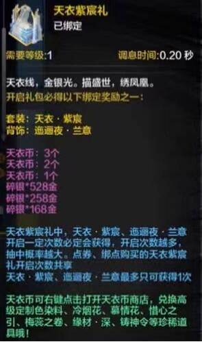 进阶版本:天衣紫宸(下图)高配版,抽骨灰盒,礼盒紫色部分是随机大概率出的,金色字体就是这套天衣紫宸和一个背饰。本期最多只能兑换100个,那个要120个才可以兑换到,所以后续天刀又出来了逐花盒子。