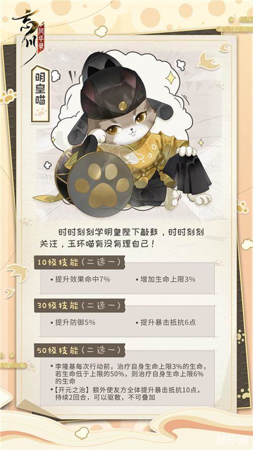 七只名士喵中的昭君喵、西施喵、嵇康喵、明皇喵、书圣喵已经开放进化功能,各位玩家“使君”可以前往游戏喵居选择猫猫进行进化,与对应名士一同共战忘川!同时,卫青喵和荆轲喵将会在下周三进行公告,下周四跟随周版本更新上线。