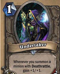 但今天的主角并不是奥秘守护者。送葬者看上去将会是一张更有意思的卡牌,他的基础属性和奥秘守护者相同,但是特效触发起来却简单很多。每次当你打出带有亡语效果的卡牌时,送葬者都会得到+1/+1的属性加成。