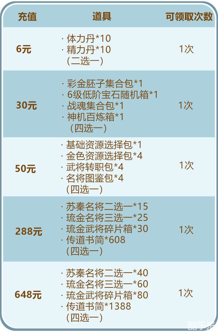少年们单笔充值指定金额,即可得到苏秦名将二选一、琉金名将三选一、琉金武将碎片箱、传道书简等珍稀道具!并且可以和欢庆佳节中的充值活动叠加,千万不要错过哟~