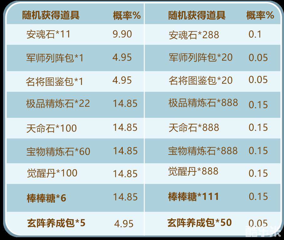 3.「儿童节礼盒」可开出:棒棒糖*111、玄阵养成包*50、觉醒丹*888、天命石*888、极品精炼石*888、安魂石*666、军师列阵包*40、名将图鉴包*40、宝物精炼石*888、棒棒糖*6、玄阵养成包*5、觉醒丹*100、天命石*100、极品精炼石*22、安魂石*11、军师列阵包*1、名将图鉴包*1、宝物精炼石*60中的随机1种。