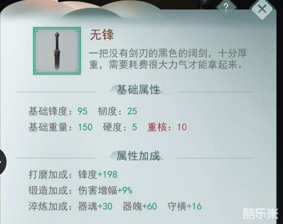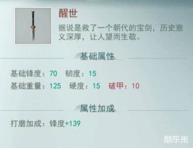 初始的属性有4种,分别是:锋度,硬度,重量,韧度,这四种属性可以通过打磨来进行提升。