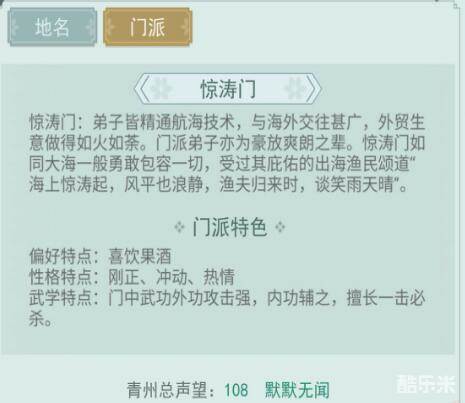 惊涛门擅长航海外交,以外贸交易见长,是名门正派,喜好果酒,门派中人刚正不阿,热情似乎,武学特性以攻击性强,擅长一击制敌为主。