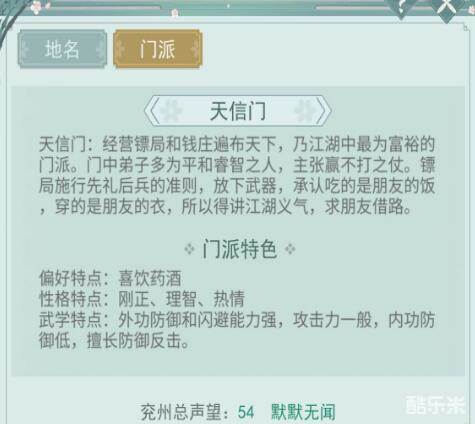 天信门也属正派宗门,以镖局钱庄著满天下,是最为富裕的门派,门中弟子以和为贵,施行先礼后兵,武学特色以对外功的防御能力强,但惧怕内功攻击为特色,具备防御反击能力。