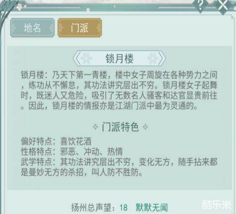 锁月楼是外功门派中唯一的邪派,擅长打探情报,是江湖之中消息最为灵通的门派。武学特性以变化多端为特色,在技能效果上有各种附加能力。