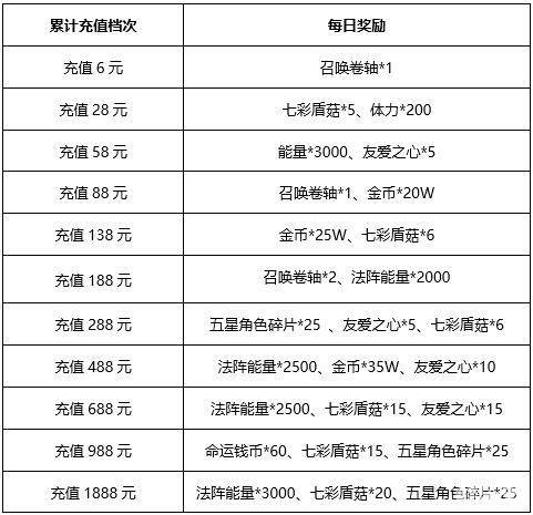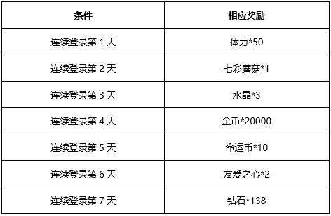 1、活动期间内,每日登录游戏,即可在邮箱中领取:体力*150、七彩盾菇*5、宝石权杖*4、金币*30000哦~