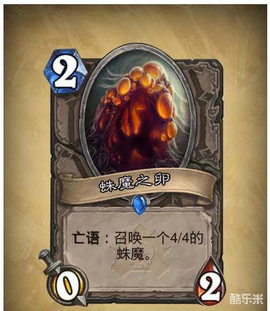 蛛魔之卵,2费的0-2随从,而它的亮点在于亡语可以召唤一只4-4的随从,所以加在快攻或是中速流的卡组中看上去是非常合适的。你的对手肯定不会蠢到去解你的蛛魔之卵,所以就需要你自己给它加buff或是用另一张卡给它加上嘲讽了。