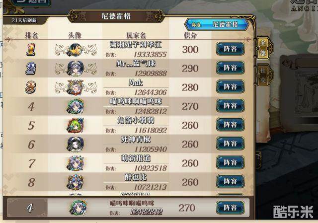 目前榜10伤害1056万,配置是2.0之前的村姑兰芳特拉娜露娜奶骑利亚纳。