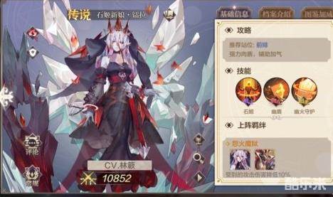 总结:火队辅助核心 可以和所有输出联动(举例:阿米尔 潘多拉 次元龙等 直接让大c第二回合开大)和龙皇联动 天崩地裂(给对手施加火焰印记 配合双增伤(龙皇被动对火焰印记的增伤和石姬被动令队友对附带火焰印记敌人的增伤)使火龙伤害最大化)同时最bug的是大招同横排加气势 能让后排在第二回合放出大招(龙皇不带气吞山河的话要三回合,没有石姬则需要四回合才能开大)不论是对pve还是pvp都是无与伦比的重要 再加上自身过硬的属性与减伤 我愿称其为全奥奇最全能坦克