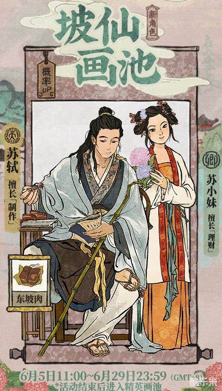 6月5日-6月29日,【坡仙画池】开启。天级新角色【苏轼】进入该画池,天级居民【苏轼】及其专属珍宝【东坡肉】概率提升。活动结束后【苏轼】进入【精英】画池。