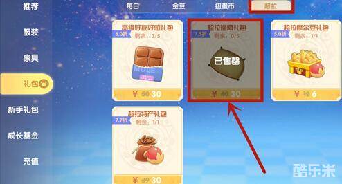 进入商城之后,还是一样找到【礼包】,在礼包中选中【超拉】,在这里就能够看到【超拉渔网礼包】,每日限购5个每个是30RMB,礼包中包含有10个高级渔网和10个中级渔网。