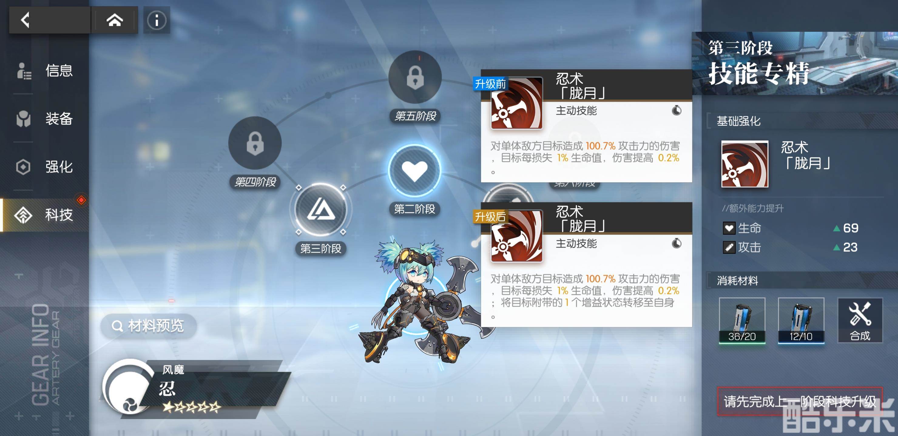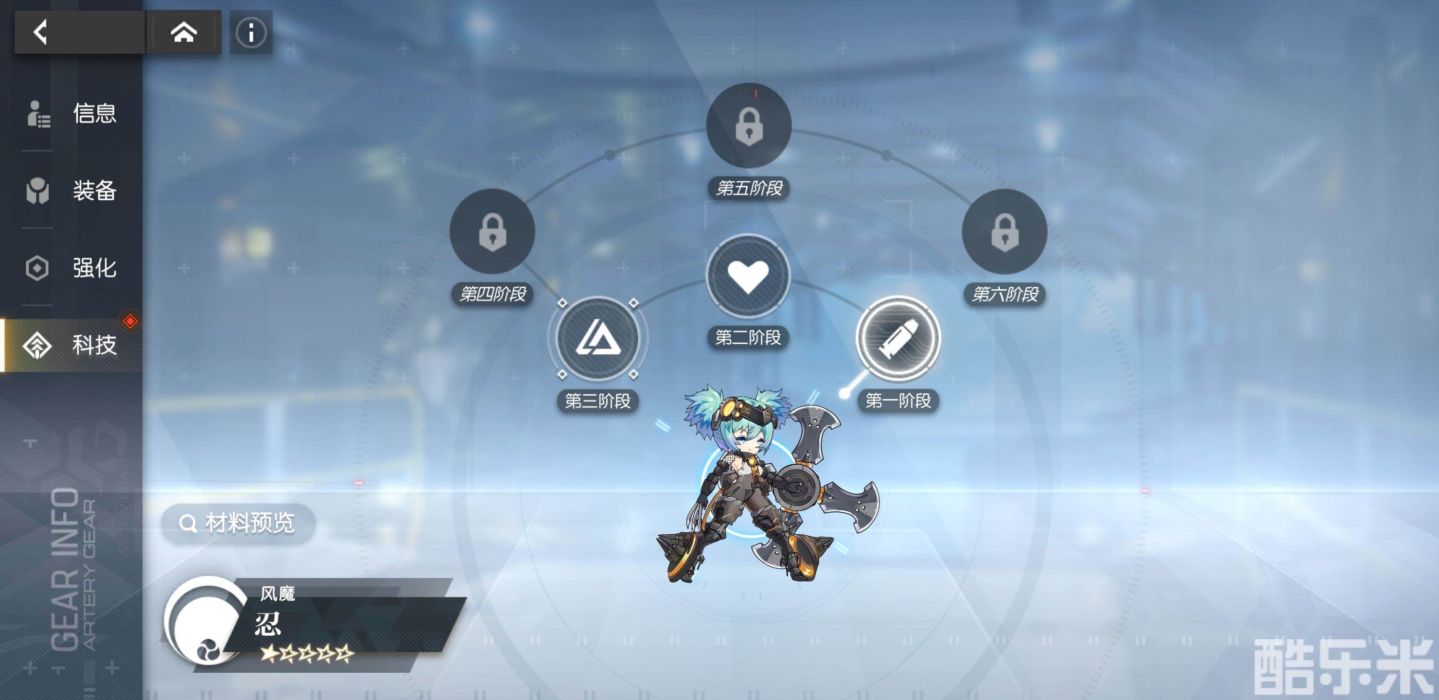 玩家升级科技需要在角色的科技面板中进行选择,每个人物共有六个阶段,初始只能预览三个阶段,后续随着玩家科技的解锁,可以查看后续的科技效果。