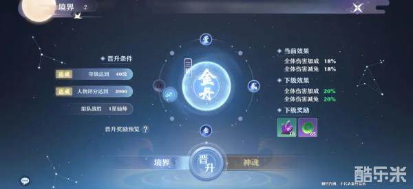 达到晋升条件可突破境界,获得全体加成,境界晋升需要达到指定等级和战力+战胜挑战人物,晋升可以得到玄晶、灵玉等道具;神魂淬炼需要大量消耗玄晶+大量铜钱。