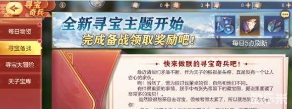 这次活动主要分为四个板块,每日物资,寻宝备战,寻宝大冒险以及天子宝库,给玩家们提供了大量的资源福利。